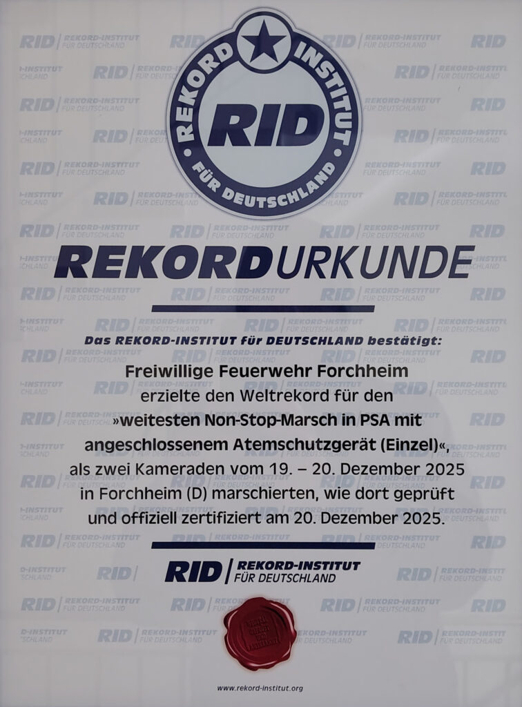 Unsere Kamerade Kai und Daniel haben sich am 19.12.2025 der ultimativen Herausforderung gestellt und gemeinsam mit der Mannschaft der FFW Forchheim den Weltrekord für die längste Strecke mit vollständiger PSA und Atemschutz nach Forchheim geholt!